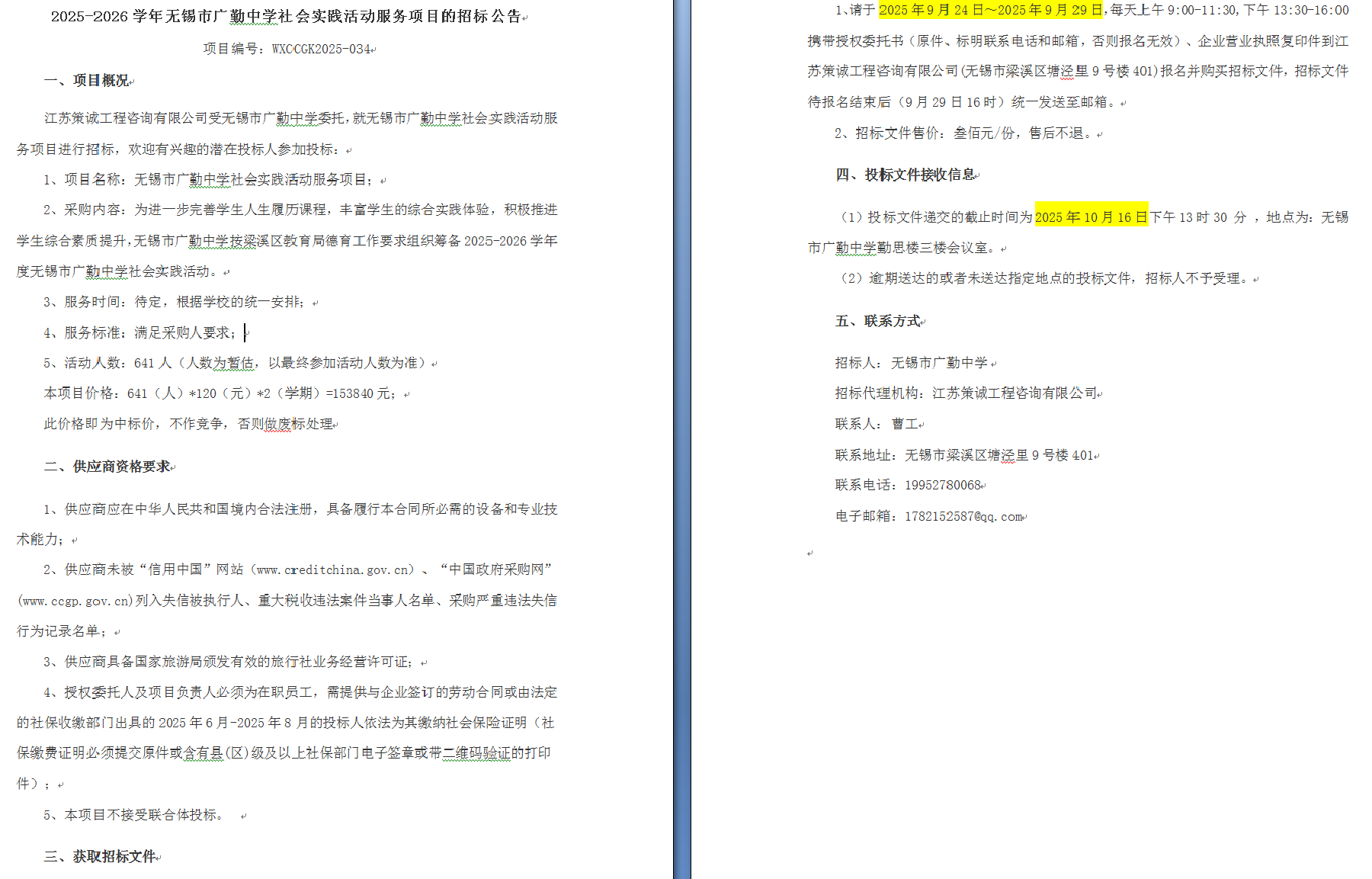 2025-2026学年无锡市广勤中学社会实践活动服务项目的招标公告