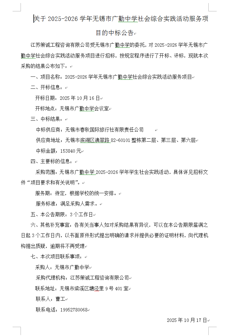 关于2025-2026学年无锡市广勤中学社会综合实践活动服务项目的中标公告