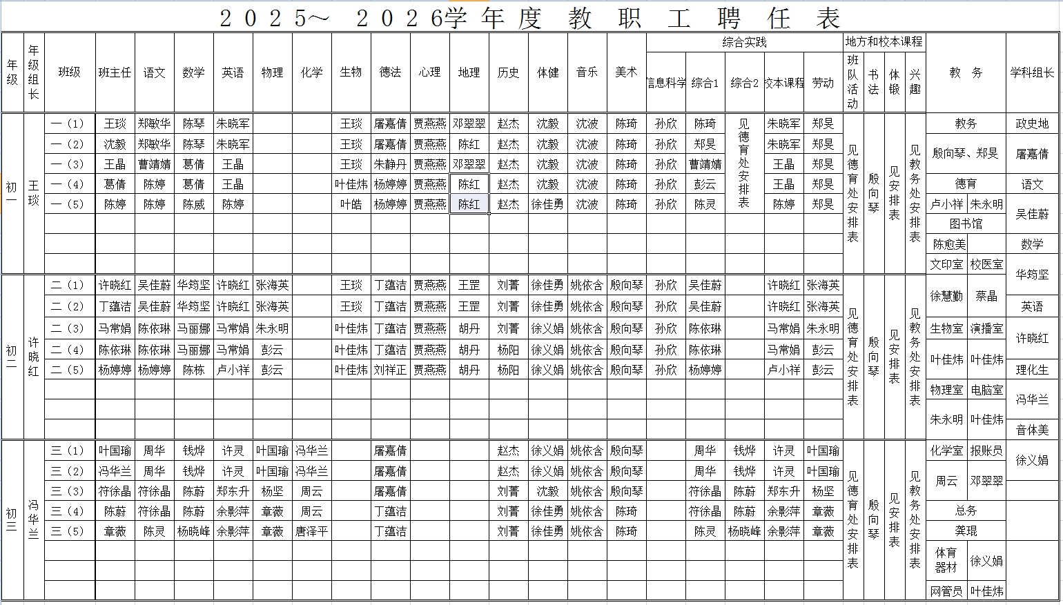 2025-2026学年春学期聘任表